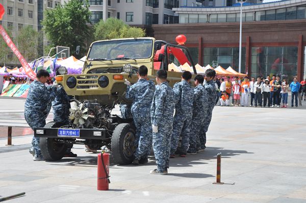 5月24日,黑龙江职业学院第二届田径运动会拉开帷幕,上午10:30,运动员在田径赛场上激烈角逐的同时,表演场地迎来了一队身着迷彩服的学生和一辆沙漠黄吉普车,他们是机械工程学院汽车检测与维修技术专业的学生及其自行改造的吉普车,他们将带来一个极具挑战的表演,即在一定时间内快速将整车分解成主要总成再装配为原貌,并将车顺利驶离场地,包括选手在内的所有人并不知道这次快速拆装过程的确切时间,所以这次表演是场上队员自我挑战的表演。