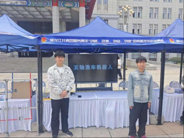 9月28日,黑龙江共青团服务青年“创新、创意、创业、创造”培育基地特色成果展在哈尔滨工程大学奥列霍夫广场举行。黑龙江职业学院能源与汽车工程学院研发的“五轴智能拟人洗车机器人”代表学校参展,并与观展师生进行了深入交流。