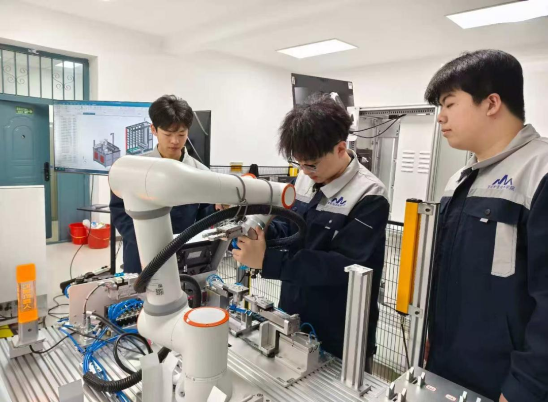 ▲ 孙文、任思宇、曲云辉 在进行工业机器人操作实训
