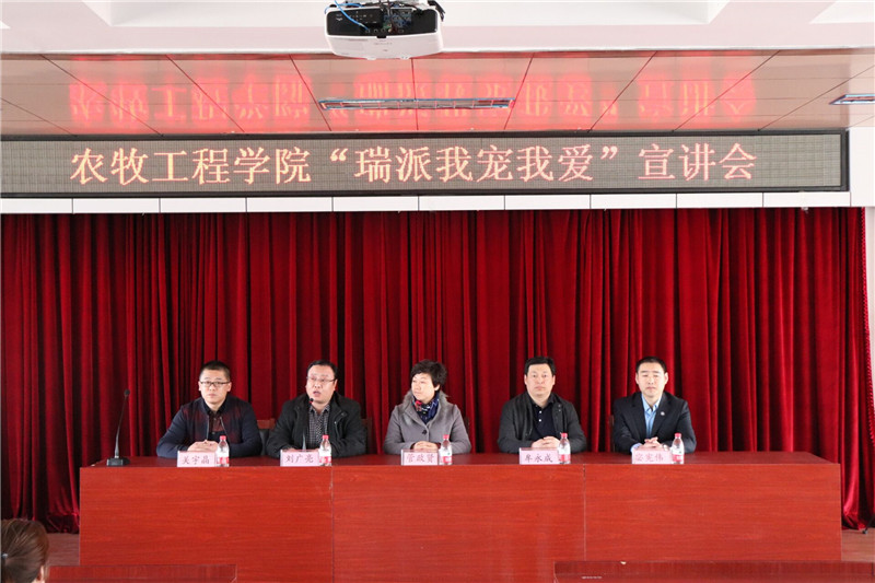 4月11日,农牧工程学院举办 “瑞派我宠我爱”宣讲会,“瑞派我宠我爱”动物医院连锁人力资源部经理管政贤,农牧工程学院教学办主任牟永成、辅导员宓宪伟、关宇晶老师出席活动,动物医学专业、宠物养护与驯导专业2016级共200名学生参加宣讲会。会议由学管办主任刘广亮主持。