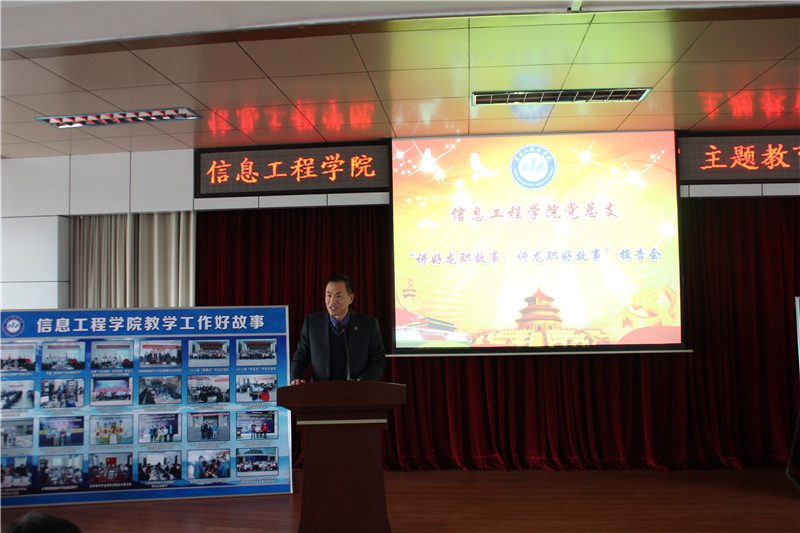 4月13日,信息工程学院党总支召开“讲好‘龙职’故事,讲‘龙职’好故事”报告会。党委委员、组织部部长钟敏强、黑龙江职业学院副校长孙福忠应邀参加。信息工程学院领导班子成员、全体教师和部分学生代表参加活动。活动由教师王兰芹主持。
