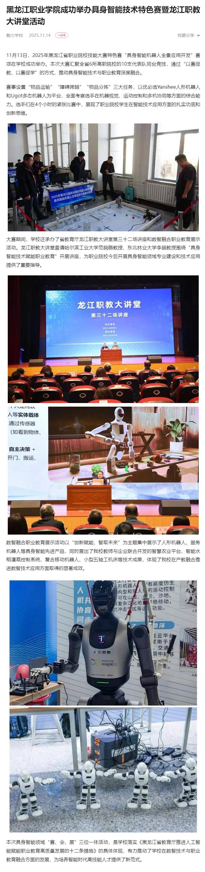 下一篇:【今日头条】黑龙江职业学院成功举办具身智能技术特色赛暨龙江职教大讲堂活动