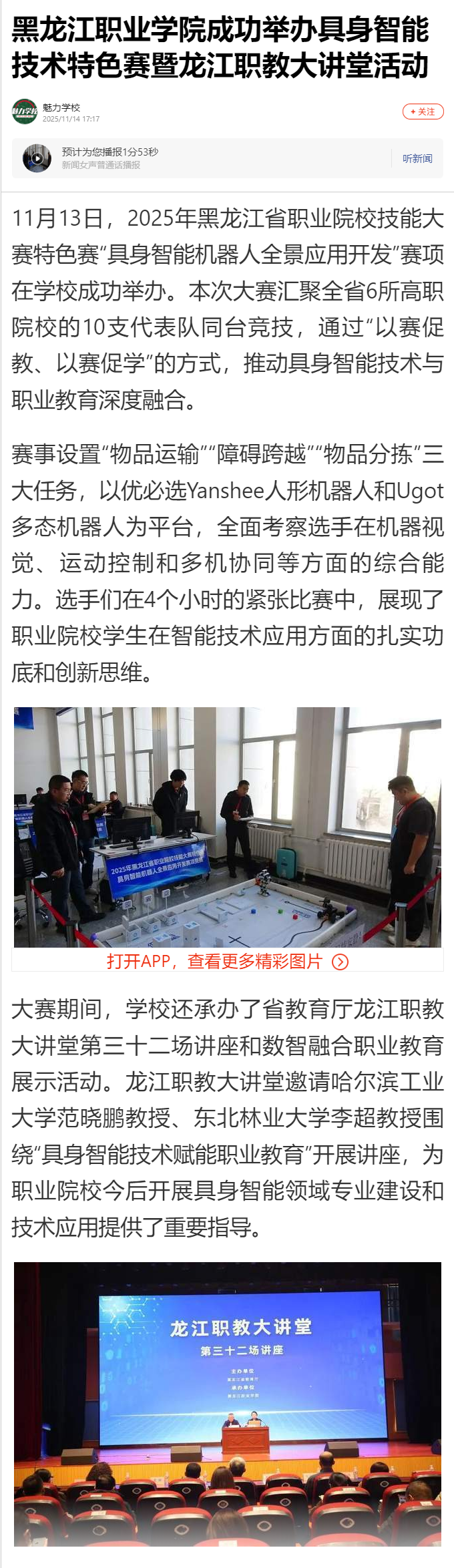 下一篇:【百度新闻】黑龙江职业学院成功举办具身智能技术特色赛暨龙江职教大讲堂活动