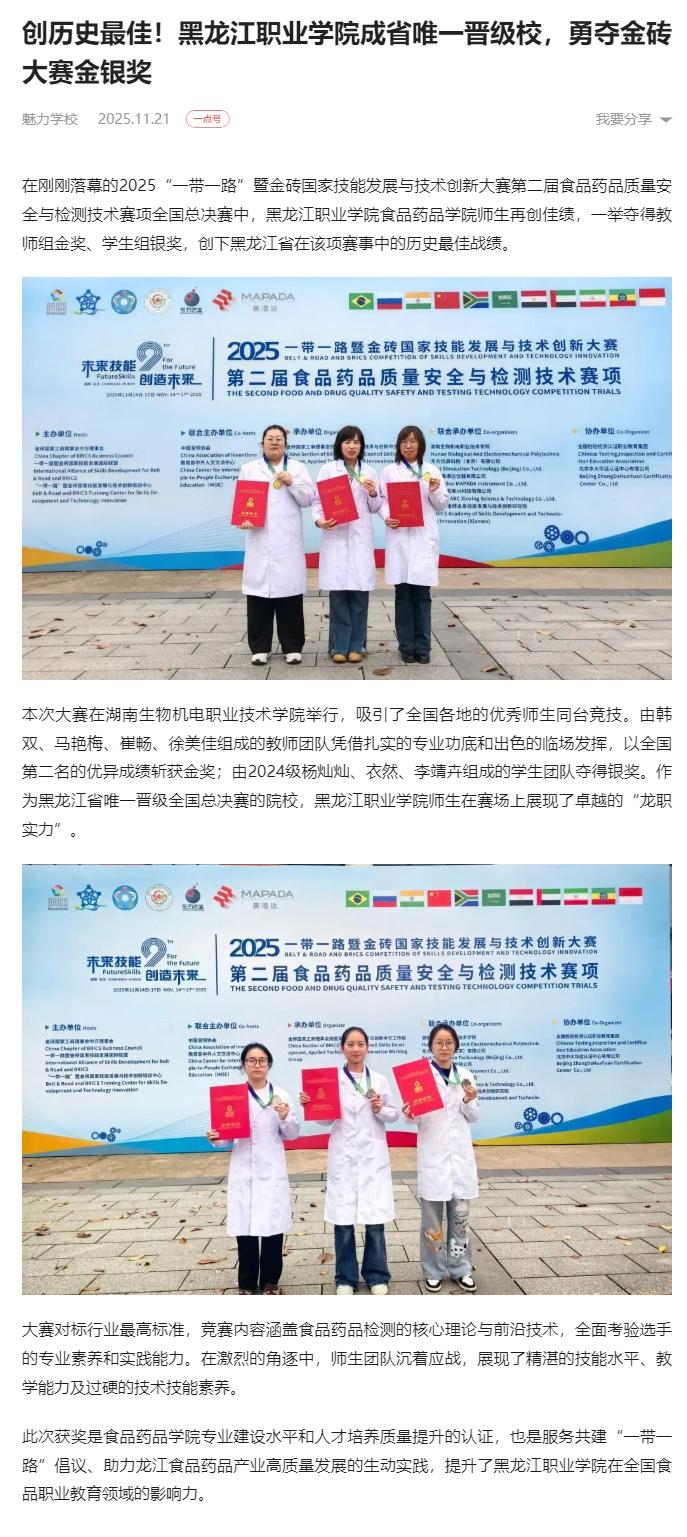 下一篇:【今日头条】创历史最佳!黑龙江职业学院成省唯一晋级校,勇夺金砖大赛金银奖
