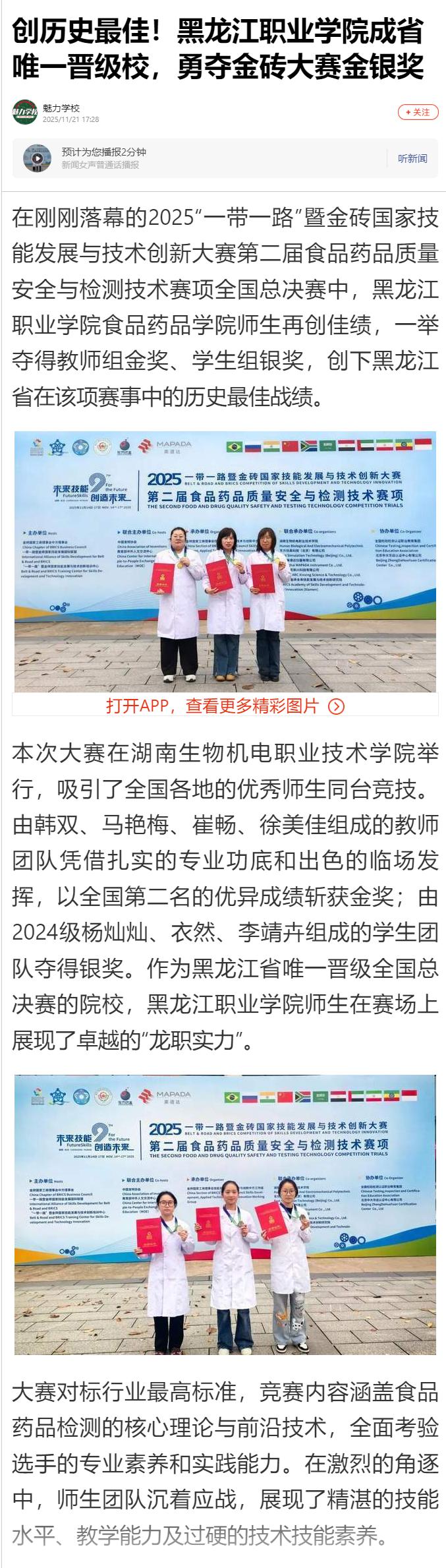 下一篇:【百度新闻】创历史最佳!黑龙江职业学院成省唯一晋级校,勇夺金砖大赛金银奖