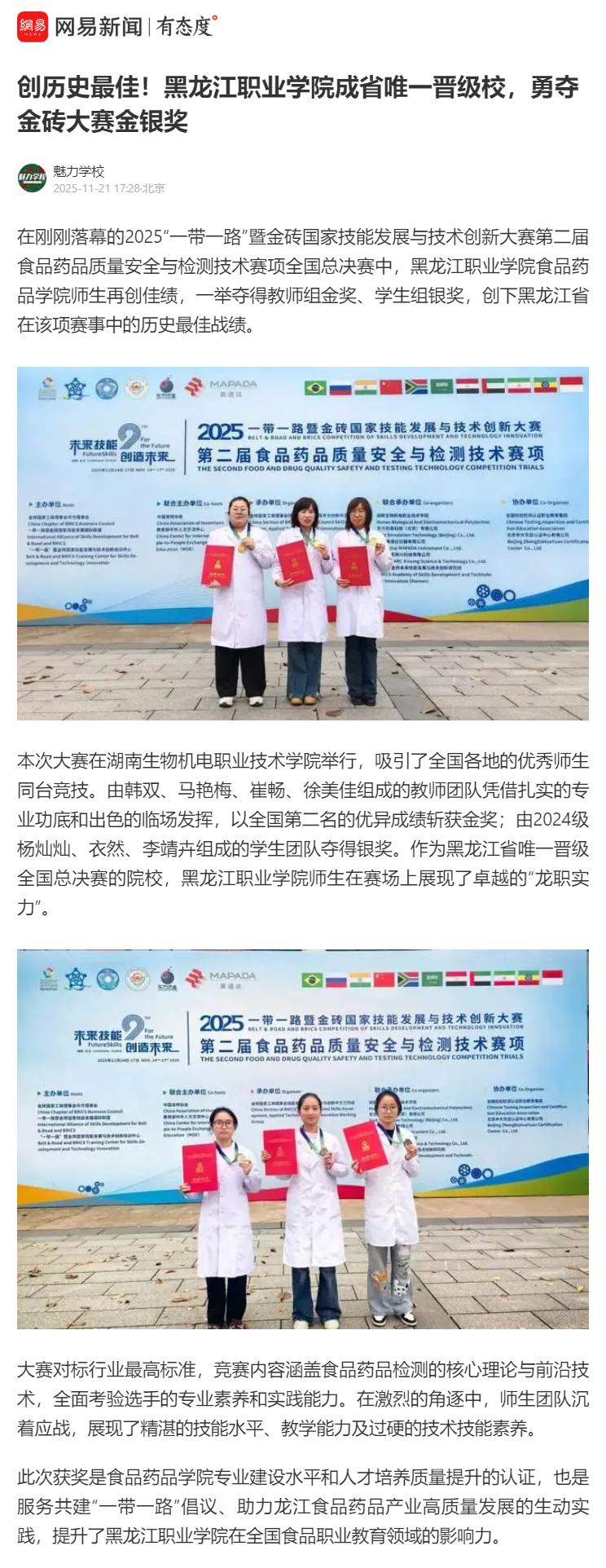 下一篇:【搜狐新闻】创历史最佳!黑龙江职业学院成省唯一晋级校,勇夺金砖大赛金银奖
