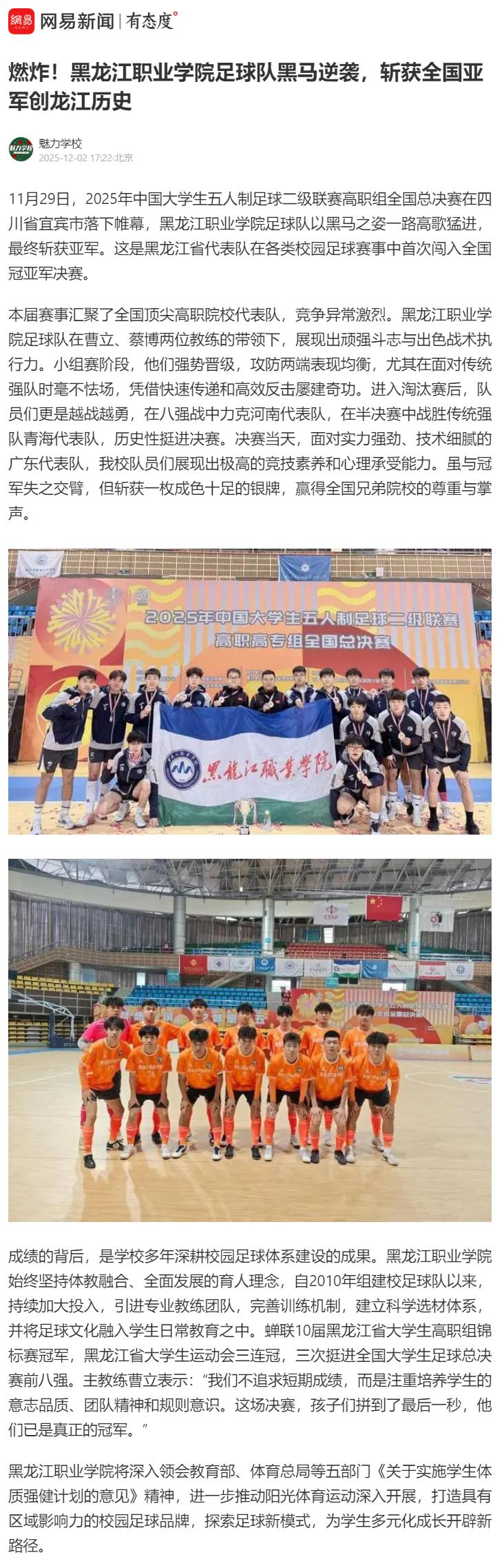 【网易新闻】燃炸!黑龙江职业学院足球队黑马逆袭,斩获全国亚军创龙江历史