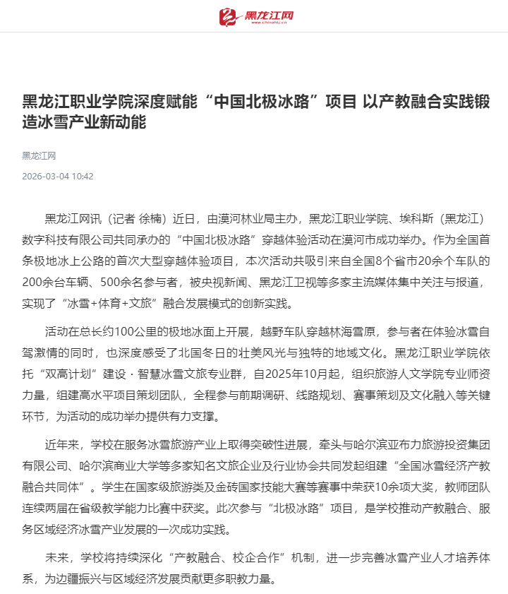 【黑龙江网】黑龙江职业学院深度赋能“中国北极冰路”项目 以产教融合实践锻造冰雪产业新动能