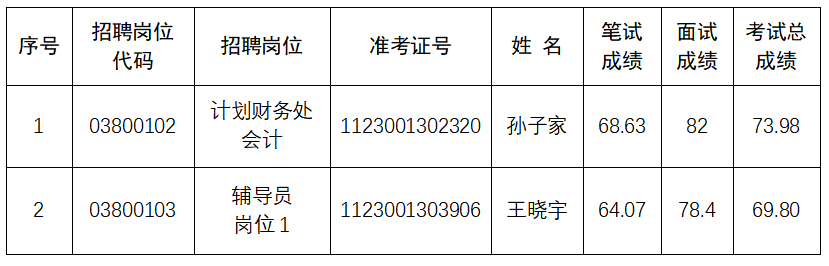 根据《黑龙江职业学院(黑龙江省经济管理干部学院)2025年下半年事业单位公开招聘工作人员公告》规定,本次公开招聘进入考察与体检环节人员中,有2人放弃考察与体检资格。按照考试总成绩从高分到低分等额递补,现将递补进入考察与体检环节人员名单公告如下: