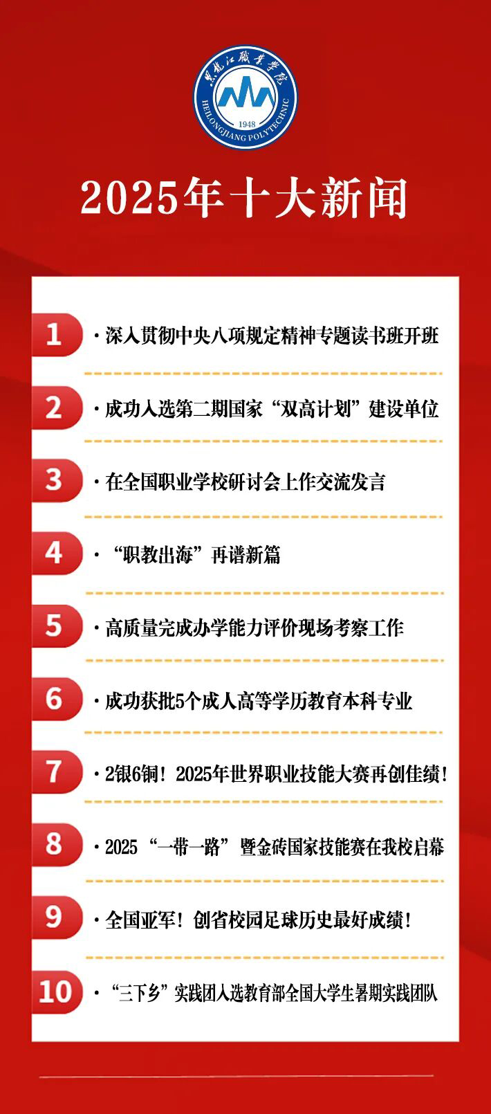 2025年,黑龙江职业学院紧紧围绕立德树人根本任务,聚焦高质量发展核心目标,奋楫笃行、砥砺深耕,以昂扬姿态开启崭新征程,以累累硕果书写发展华章。从党建引领夯实育人根基,到国际合作拓宽发展维度;从赛场争魁尽显“龙职”风采,到社会服务践行责任担当。全校师生以汗水浇灌初心,用智慧书写答卷,共同镌刻下学校2025年度砥砺奋进的坚实印记。