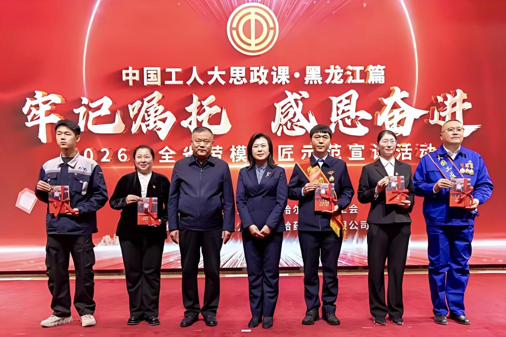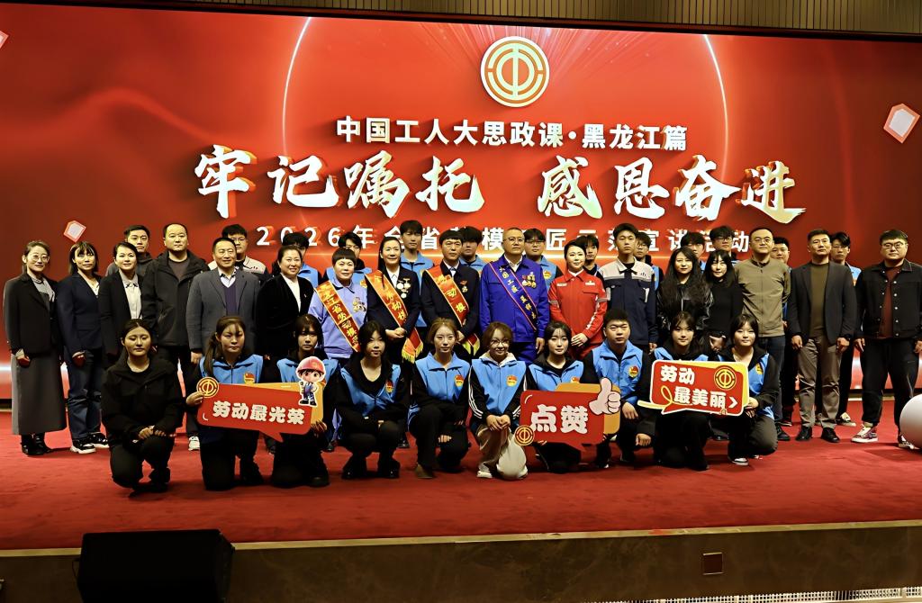 4月9日,“中国工人大思政课·黑龙江篇”“牢记嘱托 感恩奋进”2026年全省劳模工匠宣讲示范活动在哈药集团举行。省总工会党组书记、副主席栾志成,省总工会党组成员、副主席吴琼等领导出席活动。我校作为产业工人队伍建设改革试点单位代表参加本次活动,让职教学生与大国工匠近距离接触,让宣讲现场成为一堂生动的“行走的思政课”。