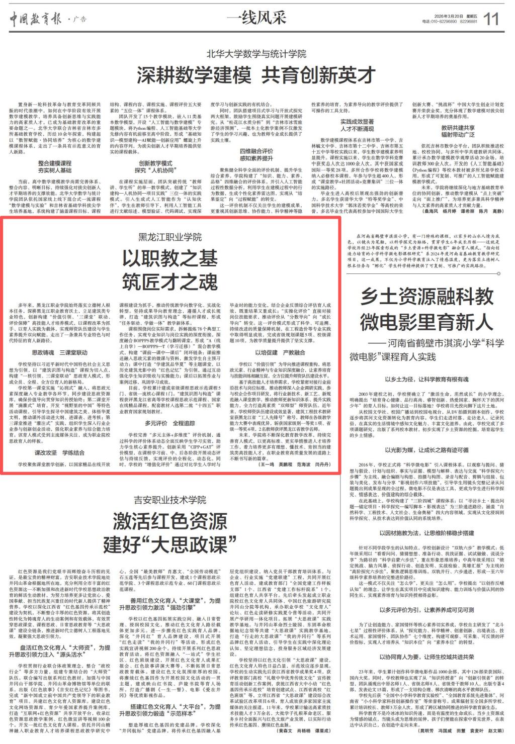 3月20日,《中国教育报》“一线风采”版面刊发我校建筑工程学院育人实践成果文章《以职教之基筑匠才之魂》,全面展现了学校在立德树人、思政铸魂、课程改革、多元评价等方面的创新实践与显著成效,为学校职业教育高质量发展再添亮眼名片。