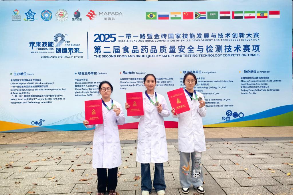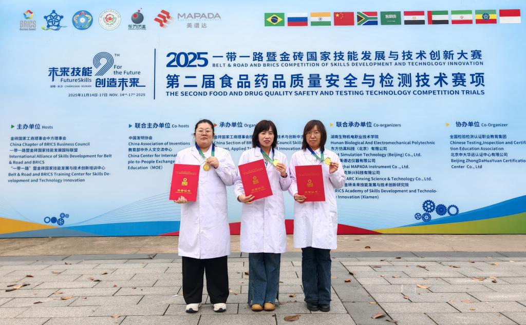 在刚刚落幕的2025“一带一路”暨金砖国家技能发展与技术创新大赛第二届食品药品质量安全与检测技术赛项全国总决赛中,我校食品药品学院师生再创佳绩,一举夺得教师组金奖、学生组银奖,创下我省在该项赛事中的历史最佳战绩。