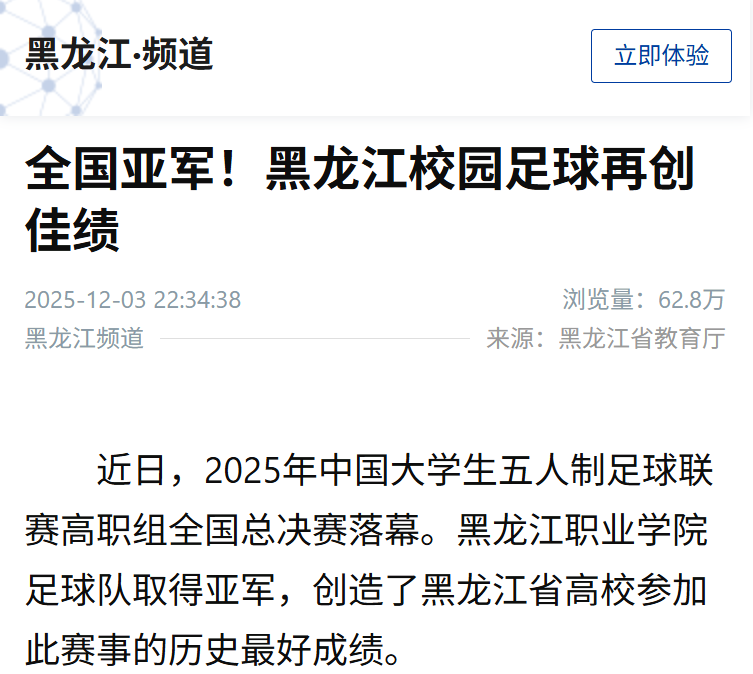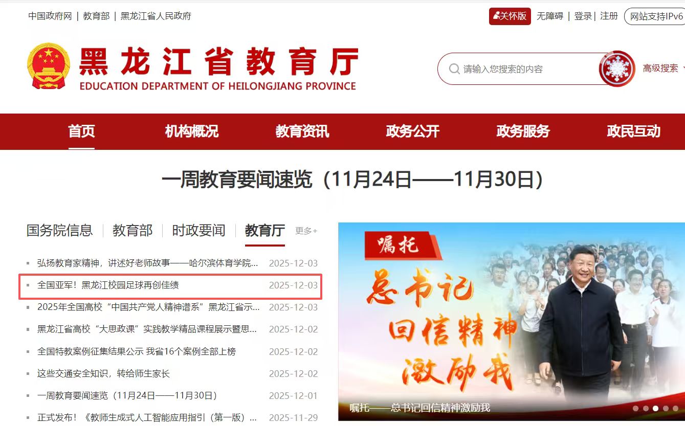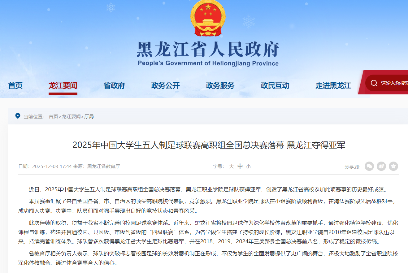 捷报传来,国家和省内多家主流媒体第一时间关注报道,新华社、人民网、黑龙江省人民政府网站、黑龙江省教育厅网站及微信公众号均以《全国亚军!黑龙江校园足球再创佳绩》为题进行报道,引发广泛反响。黑龙江省学生体育协会发来贺信,赞扬学校创造了黑龙江省校园足球的历史新篇章,获得了各组别参赛队全国总决赛第一枚奖牌,成绩斐然,可喜可贺!贺信写道:“你们以顽强意志、精湛技艺和团结精神,在全国最高水平赛事中展现了卓越风采,赛出了风格与水平,充分彰显了学校深厚的育人底蕴和昂扬向上的精神风貌。”众多兄弟院校也纷纷致电祝贺,称赞此举“为全省高职体育发展树立了新标杆”。