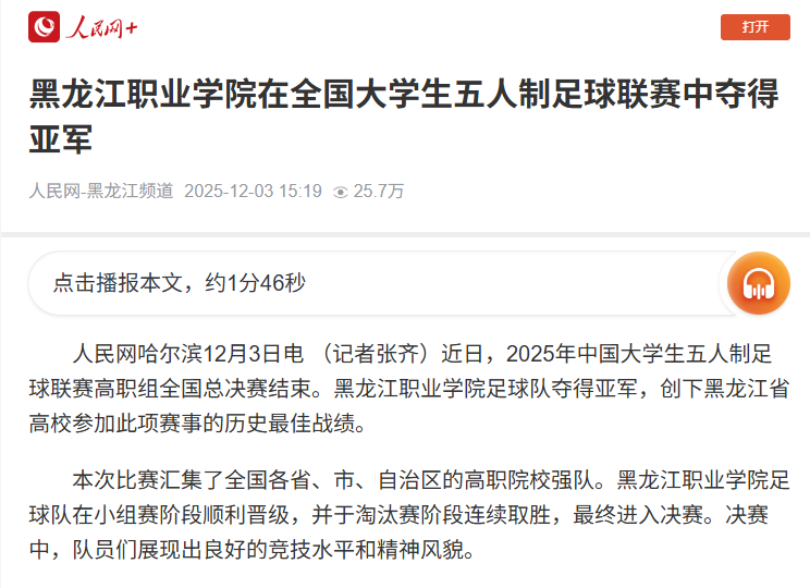 在2025年中国大学生五人制足球联赛高职高专组全国总决赛中,黑龙江职业学院男子足球队凭借顽强意志与默契配合,拼搏至最后一刻,历史性夺得银牌!这不仅是学校足球运动发展的里程碑,更实现了黑龙江省高职院校在全国大学生足球最高赛场奖牌“零的突破”。这枚沉甸甸的银牌,闪耀着拼搏的光芒,镌刻着团队的荣光。