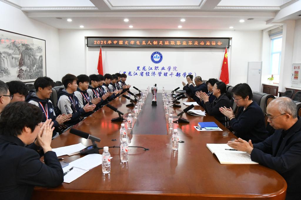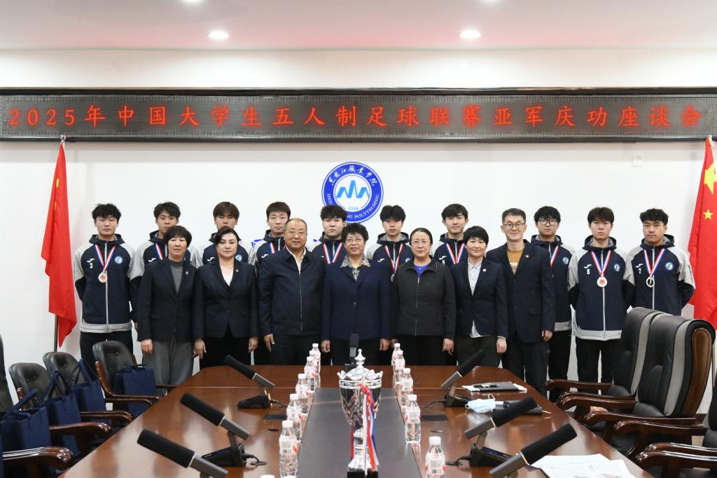 足球队凯旋后,学校召开庆功座谈会。党委书记崔治春、副校长吴艳秋与全体队员、教练员深入交谈。崔治春表示,热烈祝贺“龙职”学子荣获2025年全国大学生五人制足球联赛高职高专组亚军,同学们为“龙职”增光、为龙江添彩,展现了非凡的拼搏精神!同学们在赛场上淋漓尽致地体现出“龙职”足球、“龙职”体育的团结拼搏、坚韧不屈的精神,这正是“龙职”学子应有的姿态。这份荣誉来之不易,离不开队员们平日的刻苦训练、赛场上的顽强拼搏,以及精湛的战术配合。五人制足球虽规模小,却更考验团队的协作与智慧。学校一直以来高度重视体育育人工作,通识教育学院常抓不懈,教练员们辛勤指导,同学们全力付出,共同铸就了今天的成绩。“龙职”足球已成为一种品牌、一种精神,在全国产生了积极影响。希望同学们将这份拼搏精神延续到人生的竞技场上,转化为学习动力,在未来的学习与生活中再创佳绩。也希望全校师生员工学习足球队追求卓越的精神,共同推动学校各项事业向前发展。会上,教练员与队员代表分别发言,分享参赛心得与奋斗感悟。
