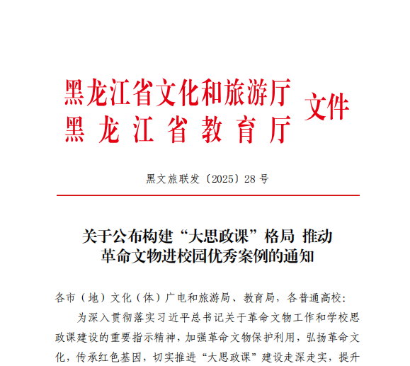 同时,在黑龙江省文化和旅游厅、省教育厅联合开展的“构建‘大思政课’格局,推动革命文物进校园”活动评选中,我校马克思主义学院教师张丽艳与第四野战军纪念馆合作研发的教学案例《从“翻身农民”到“钢铁战士”——参观第四野战军纪念馆体悟“人民战争”思想实践》入围,展现了我校在整合地方红色资源、创新实践教学模式方面的积极探索。