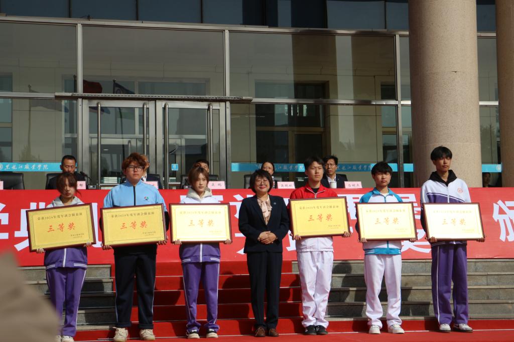 ▲学生工作部部长赵彦生为分列式三等奖代表颁奖