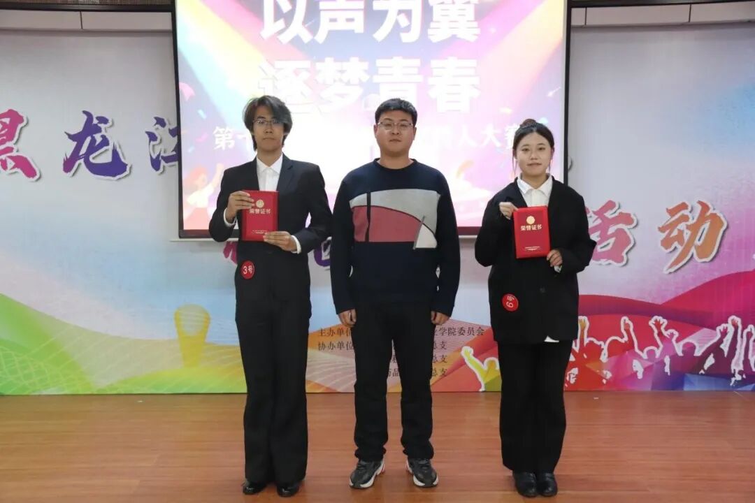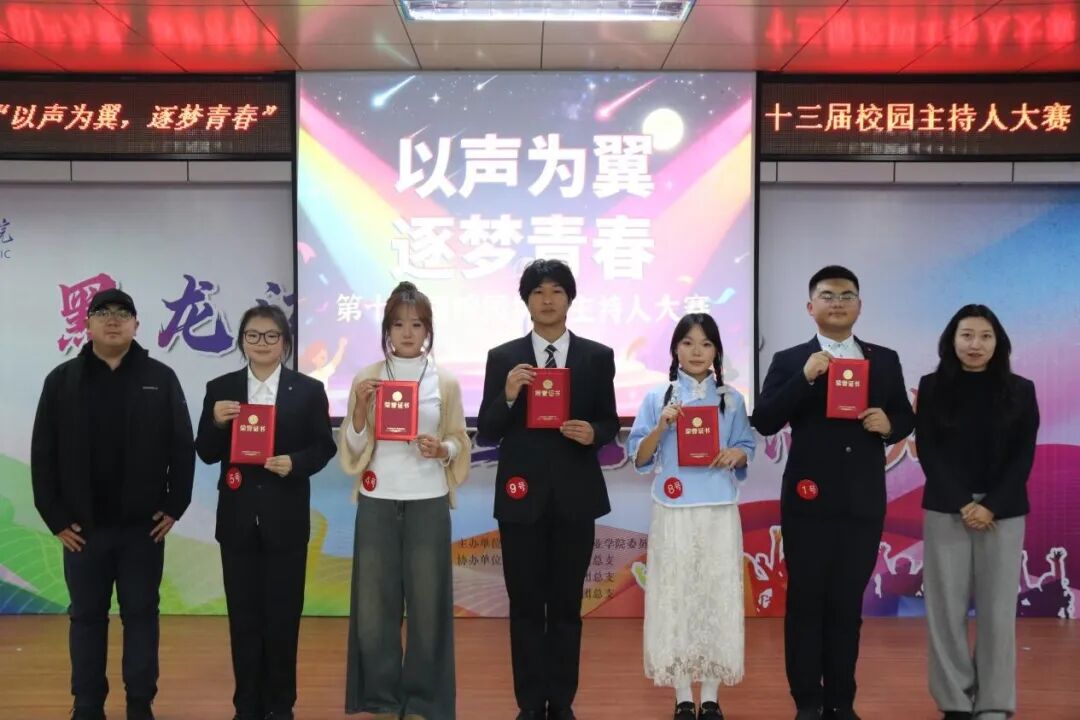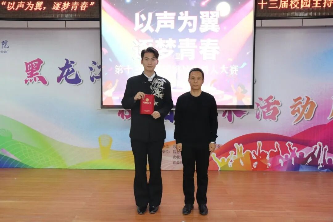 经过多轮比拼,最终会计金融学院杨子沐获得金话筒奖,旅游人文学院刘雅琪、能源与汽车工程学院纪凯峰获得银话筒奖,智能制造技术学院张萌芮、建筑工程学院孙美静、数字商贸学院董纹如获得铜话筒奖。到场老师登台为获奖同学颁奖。