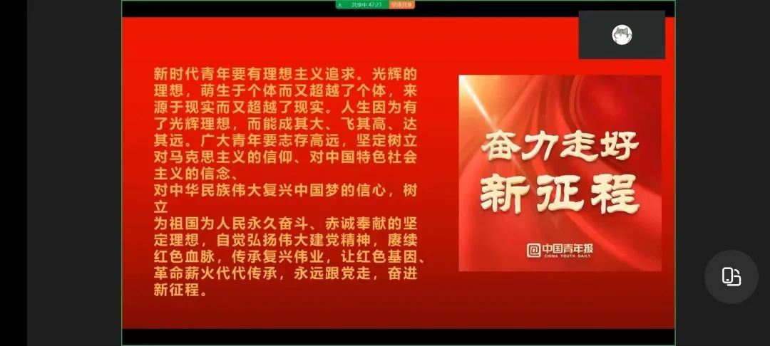 班会上,同学们纷纷表示当代中国青年是与新时代同向同行、共同前进的一代,生逢盛世,肩负重任。立志做有理想、敢担当、能吃苦、肯奋斗的新时代好青年,敢于拼搏、为实现全面建设社会主义现代化国家的奋斗目标努力奋斗,为实现中华民族伟大复兴贡献青春力量。