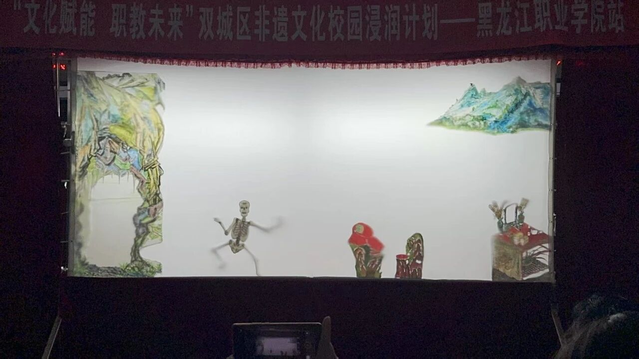 一块幕布,一束光影,数张精雕细琢的皮偶,伴着悠扬唱腔,演绎千年传奇——这,便是非遗皮影戏,被称为“有声电影的鼻祖”“中国最早的卡通”,它起于西汉,兴于唐代,盛于清代,承载着中华民族两千多年的历史记忆,是中华民族最古老的民间艺术之一,更是中国独有的民间艺术。其表演融合了唱腔、音乐、雕刻技艺。2007年,皮影戏被列入黑龙江省级非遗名录,是双城区域内首批被列入省级非遗名录的非遗项目。此次活动中,皮影戏省级代表性传承人徐桂文老师表演了《三打白骨精》以指尖为笔,以兽皮为卷,在光影交织的舞台上书写着神奇,“一口唱尽千古事,双手舞动百万兵。”师生们零距离感受到了皮影戏这一光影艺术的独特魅力