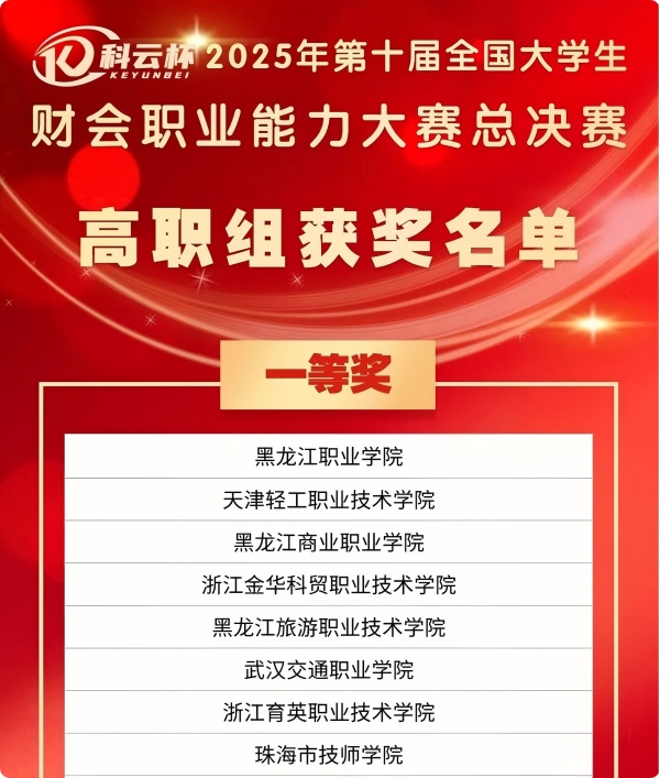 12月20日,第十届“科云杯”全国大学生财会职业能力大赛总决赛圆满落幕。我院学生董雯静、郑雪茹、张博雪、桂佳怡组成的参赛队伍,在指导教师孙海涛、于涵的精心指导下,经过两轮激烈角逐,从总决赛120支高职组精英战队中脱颖而出,最终以总分第一名的优异成绩荣获全国一等奖,登顶全国榜首,取得了历史性突破,充分展现了我校在数智财经人才培养领域的综合实力与育人成效。