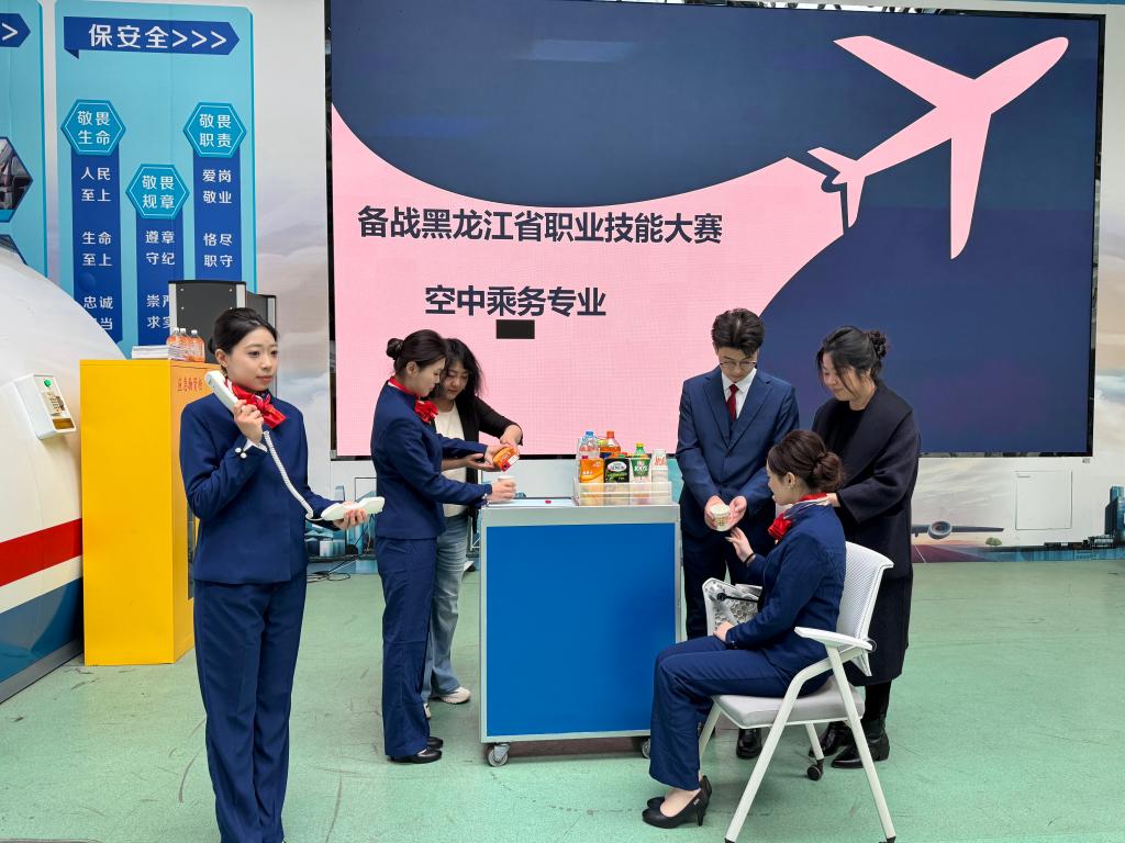 技能精进,以赛促学是关键一环。学院将技能竞赛作为检验教学成果、锤炼实战本领的核心环节,积极营造“赛中练、练中学”的浓厚氛围。空中乘务专业师生正紧扣省职业院校技能大赛标准,在模拟舱内进行高强度、全流程的实景化训练,通过竞赛环境精准淬炼服务技能与应急能力,真正实现了“以赛促学、以赛促能”的目标。