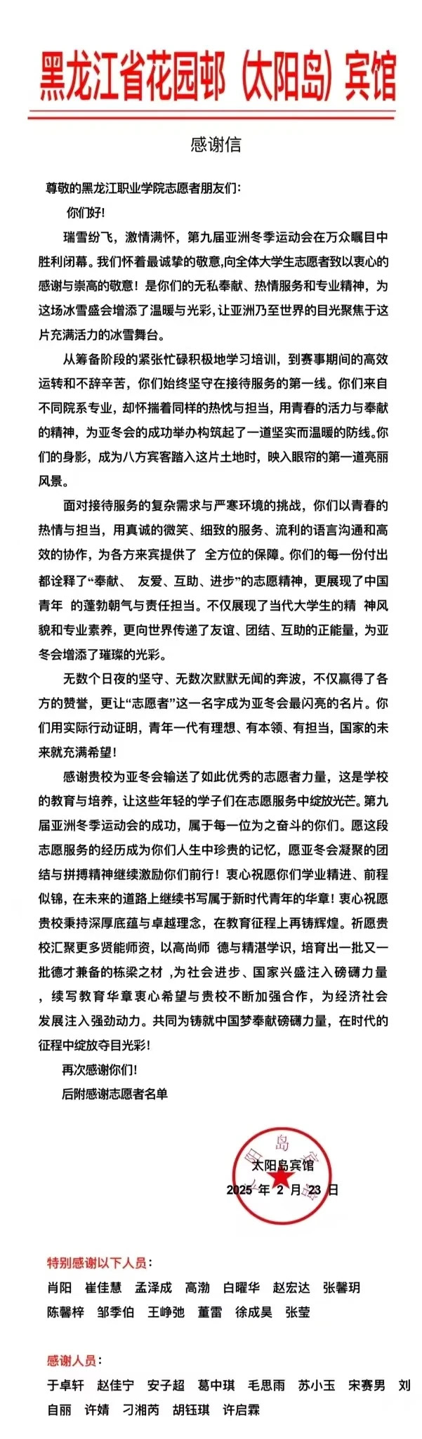 收到来自黑龙江省花园邨(太阳岛)宾馆感谢信