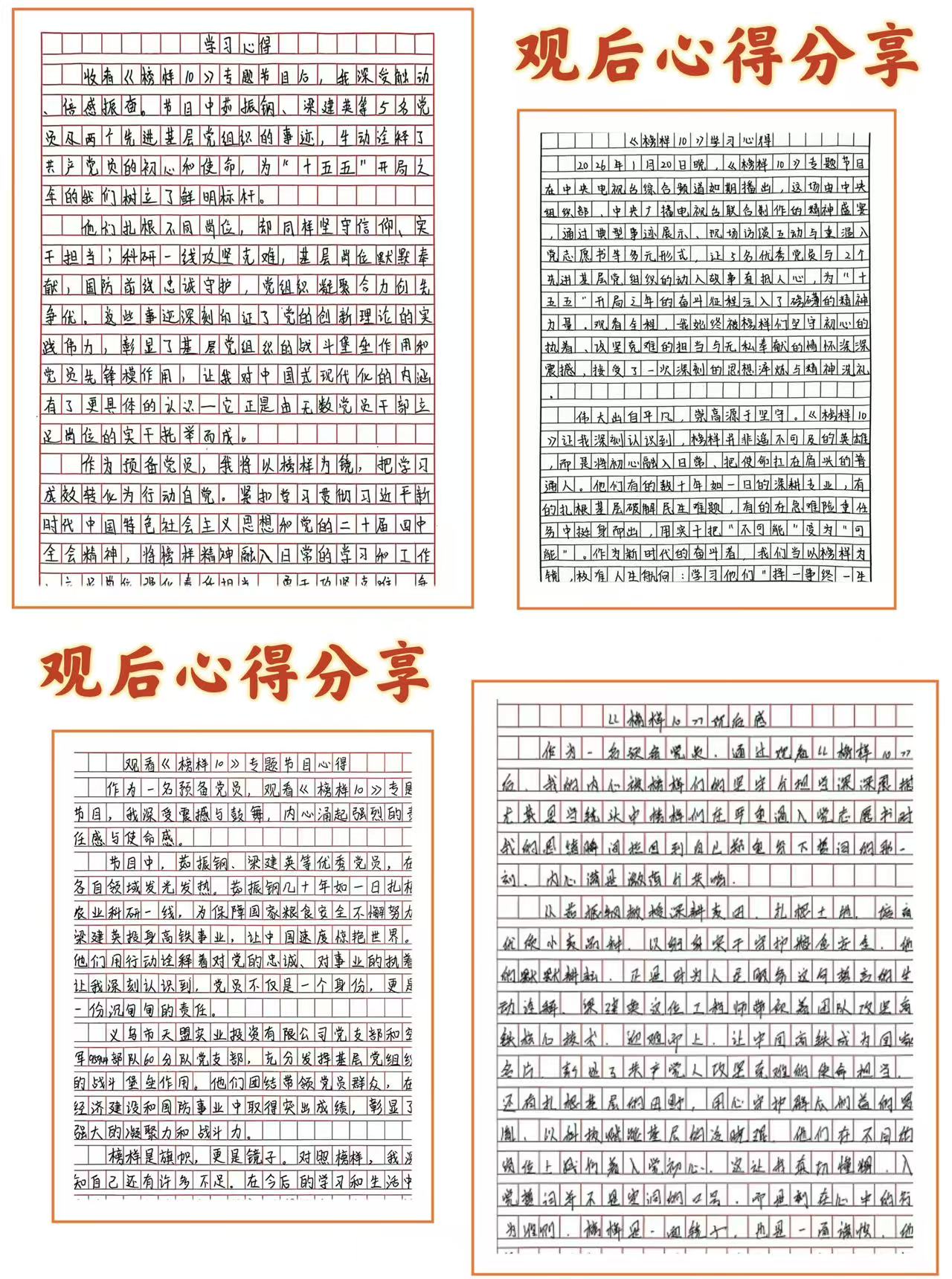 节目中,茹振钢、梁建英、冷晓琨、田野、罗胤等 5 名党员同志,以及义乌市天盟实业投资有限公司党支部、空军 95944 部队 60 分队党支部的典型事迹依次展播。一个个鲜活的人物形象、一段段感人至深的奋斗故事,生动展现了新时代共产党员坚定理想信念、勇于担当作为、甘于无私奉献的精神风貌,让同学接受了一次深刻的思想淬炼和精神洗礼。