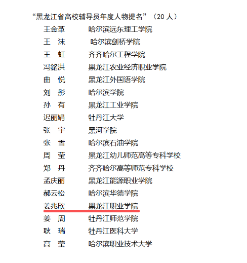 近日,在中共黑龙江省委宣传部、省委教育工委、省教科文卫体工会共同组织的2025年“龙江最美高校辅导员”暨第十七届“黑龙江省高校辅导员年度人物”推选展示活动中,黑龙江职业学院建筑工程学院辅导员姜兆欣斩获“黑龙江省高校辅导员年度人物提名奖”。这一省级荣誉的获得,为学院辅导员队伍建设擦亮名片。在学院深耕“树匠心”思政育人模式的引领下,依托“党建+师资建设”平台,通过筑牢思想根基、提升专业能力塑造高素质辅导员队伍,此次荣誉正是平台建设成效的有力证明,更为学校“打造支撑振兴的龙头高职”奋斗目标,学生工作高质量发展,再添硕果!