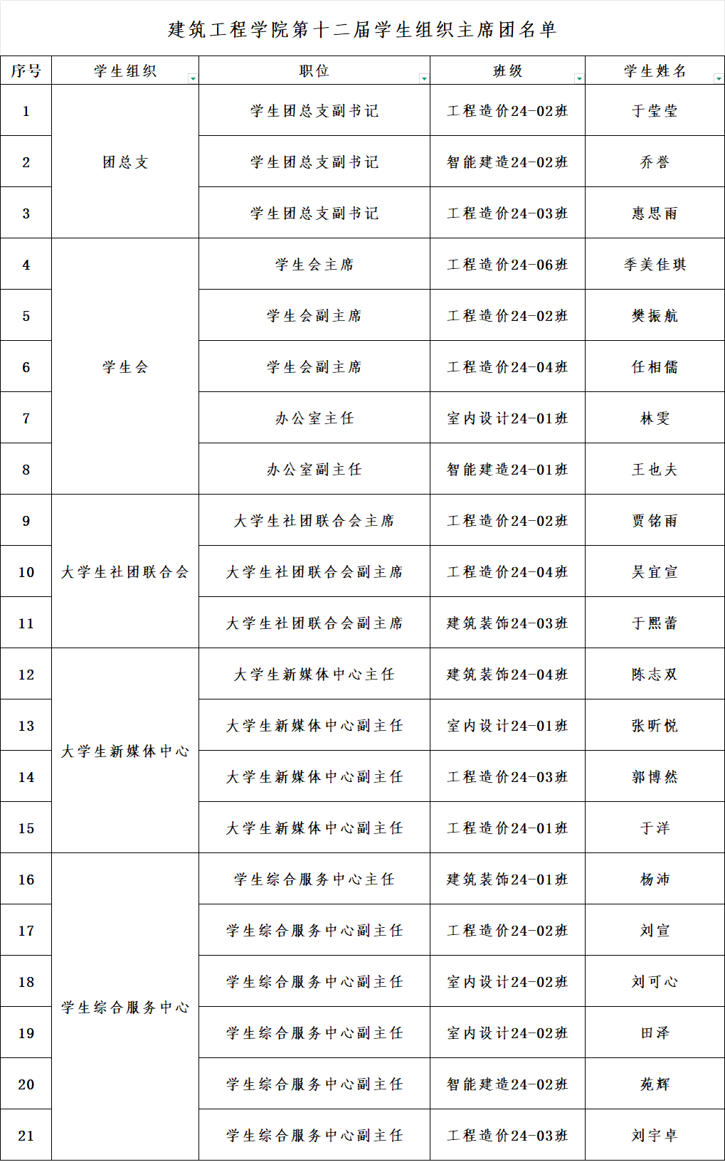 建筑工程学院第十二届学生组织主席团名单