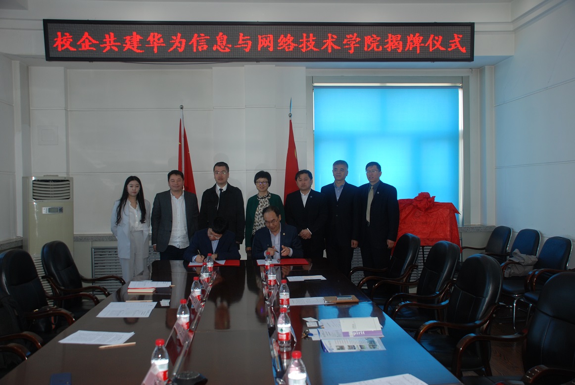 副校长王明海与华为黑龙江企业业务部副部长彭睿签订华为信息与网络技术学院校企合作协议