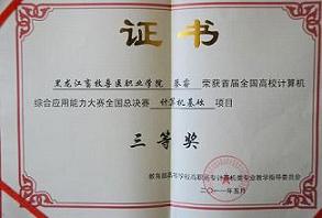 黑龙江省共有9所院校参加本次大赛,我校信息工程学院图像09-301班蔡睿同学经过初赛选拨,代表我校参加本次大赛。蔡睿同学在高手如林的竞争中,沉着冷静,经过三场激烈的角逐,最终不负众望,在网络与安全、常用软件、计算机基础三个项目中均发挥了最佳水平,一举夺得网络与安全项目个人二等奖、常用软件项目个人三等奖、计算机基础项目个人三等奖,并为我院获得团体二等奖的可喜成绩,同时我院金忠伟老师获得指导教师二等奖,卢凤伟老师获得指导教师三等奖。在全国高职院校中展示了我院学生计算机专业知识水平,体现了我院计算机专业办学能力。(团体奖项设置如下:冠、亚、季军各1名,一等奖10名,二等奖20名,三等奖30名,黑龙江省有1所院校获团体一等奖、2所院校获团体二等奖,5所院校获团体三等奖,1所院校获得团体亚军。)