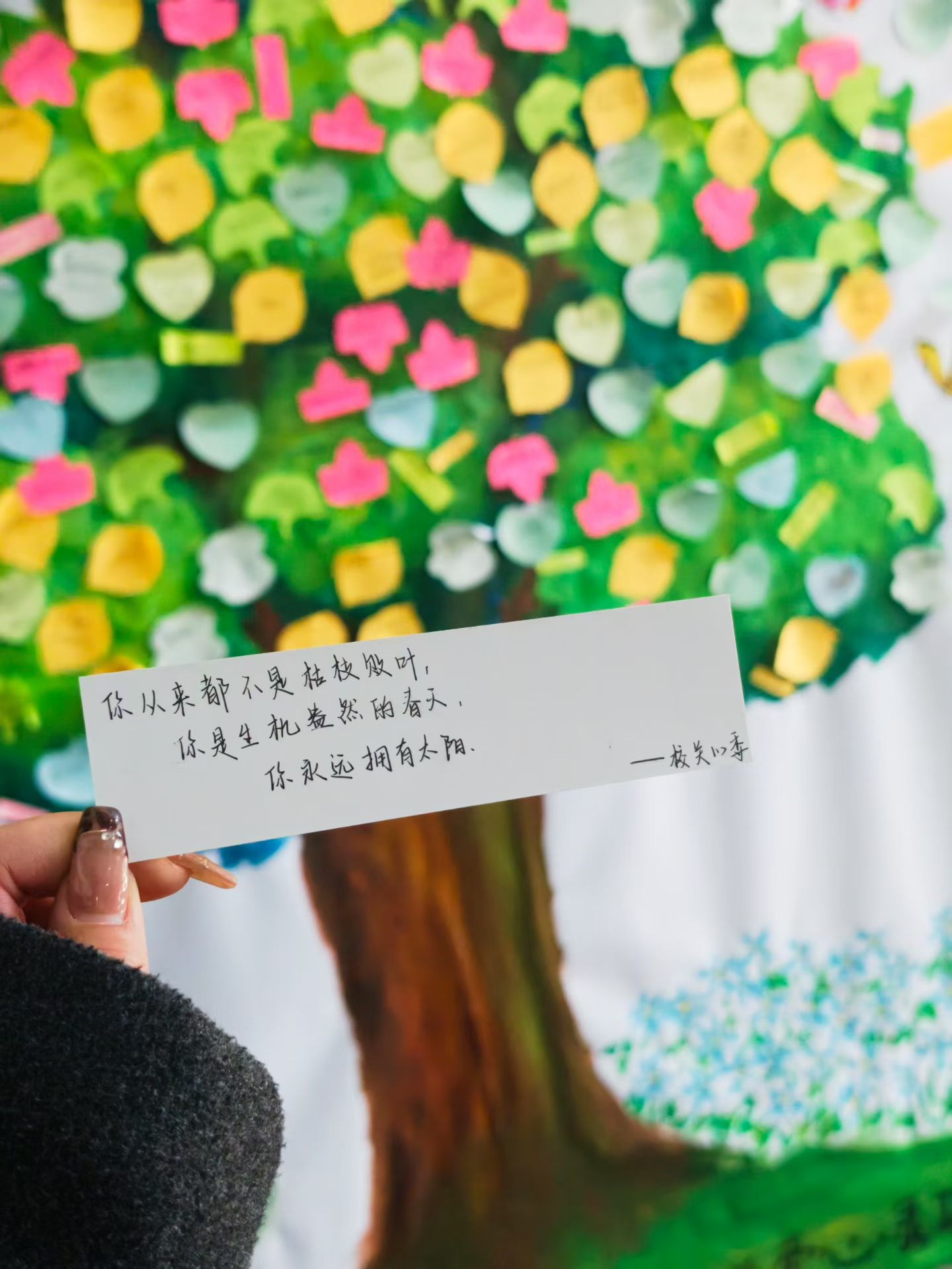 此次活动打破传统心理健康教育的说教模式,巧妙将植树节“播种希望、顽强生长” 的寓意与心理育人理念相结合,以贴近学生的互动形式搭建情绪释放的平台。同学们在动手参与中释放压力、涵养心态,在彼此的心愿分享中获得共鸣与鼓舞。大家纷纷表示,此次活动既有新意又有温度,橡树扎根生长的特质让自己深受触动,未来将以树为榜样,扎根当下的学识积累,向阳面对成长中的困惑与挑战,以健康自信的姿态奔赴学习与生活,努力成为内心有光、坚韧向上的新时代学子。