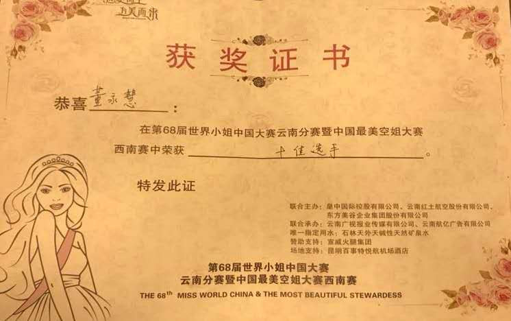 近日,在第68届世界小姐中国大赛云南分赛暨中国最美空姐大赛西南赛区中,学校2016级空乘专业学生董永慧表现优异,一路过关斩将,最终荣获十佳选手荣誉称号。 世界小姐(Miss World)、环球小姐(Miss Universe)及国际小姐(Miss International)选举并称为世界级的三大选美赛事。其中,世界小姐大赛始于1951年,是全球历史最悠久、影响力最盛、美誉度最高的顶级选美赛事。中国最美空姐大赛作为第68届世界小姐中国大赛的特别赛事,为美丽的航空人实现世界小姐梦想提供了平台,期待龙职空乘学子在追逐梦想中有更出色的表现,为母校争光。